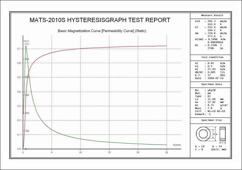 Automatic measurement on basic magnetization curve and magnetic hysteresis loop under static state of soft magnetic material, accurate measurement on static magnetic characteristic parameters such as initial permeability μi, maximum permeability μm, saturation magnetic induction Bs, remanence Br, coercive Hc and hysteresis losses Pu.