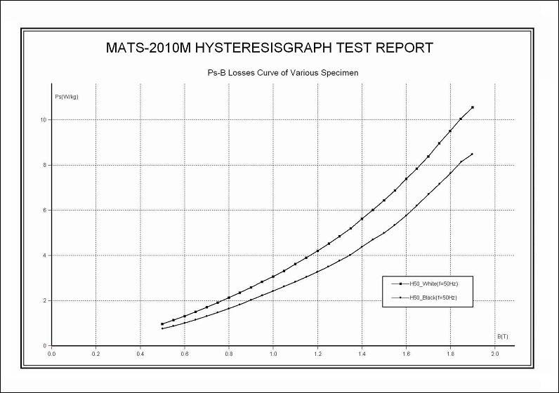 Automatic measurement on dynamic hysteresis loop of soft magnetic (silicon steel) material under 50Hz, 60Hz, 400Hz and 1kHz, accurate measurement on dynamic magnetic characteristic parameters such as amplitude permeability μa, loss angle δ, total losses Ps, remanence Br and coercive force Hc.