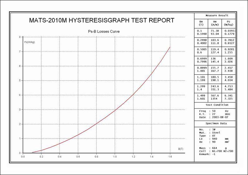 Automatic measurement on dynamic hysteresis loop of soft magnetic (silicon steel) material under 50Hz, 60Hz, 400Hz and 1kHz, accurate measurement on dynamic magnetic characteristic parameters such as amplitude permeability μa, loss angle δ, total losses Ps, remanence Br and coercive force Hc.